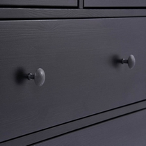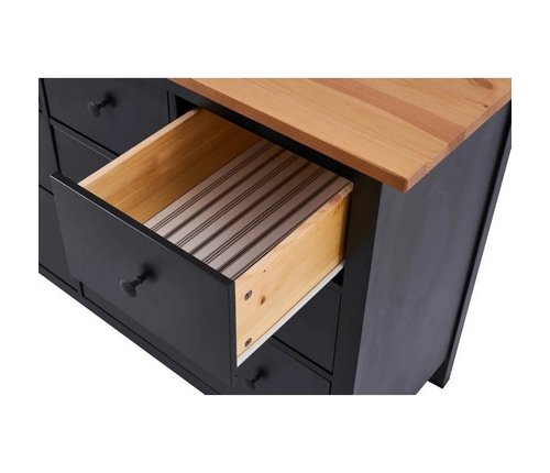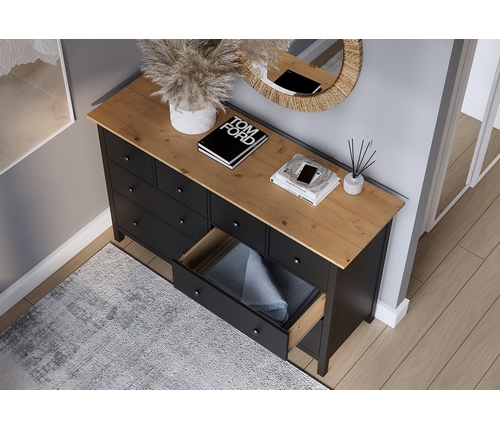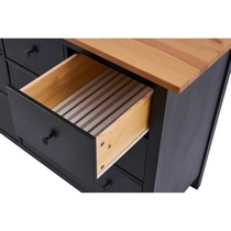 Комод оснащен четырьмя верхними маленькими и четырьмя большими выдвижными ящиками разной высоты.
