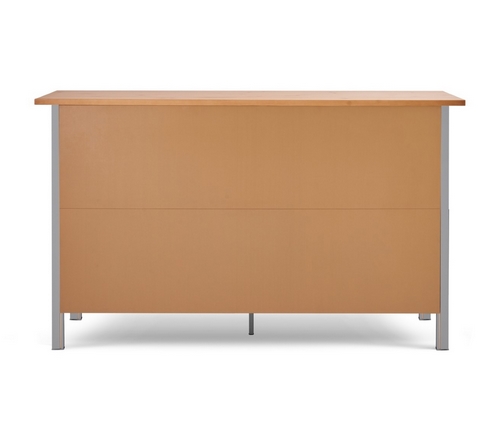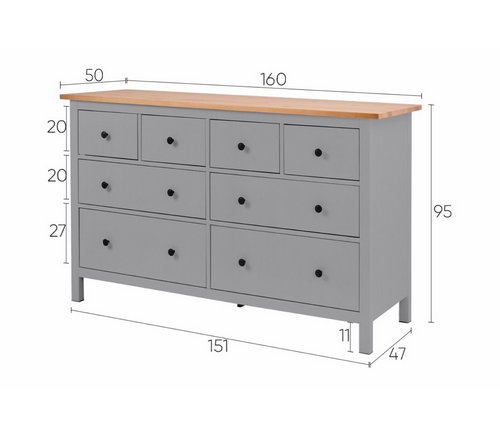 Комод оснащен четырьмя верхними маленькими и четырьмя большими выдвижными ящиками разной высоты.
