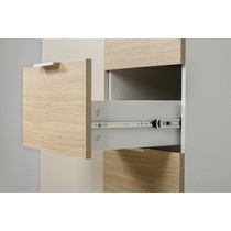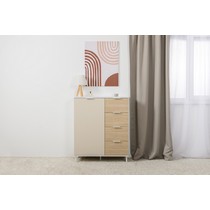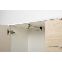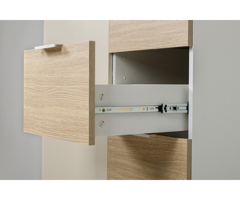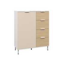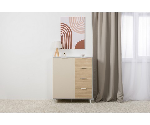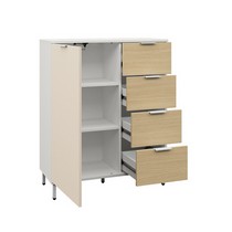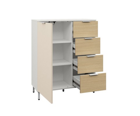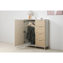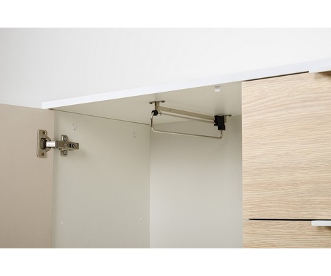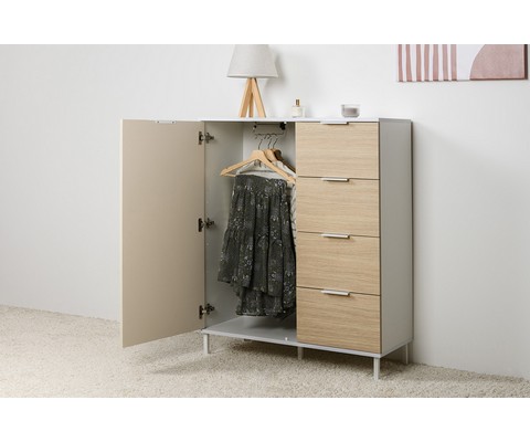 Комод состоит из четырех выдвижных ящиков и отсека с выдвижной металлической штангой и дверцей.