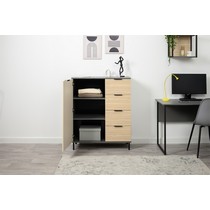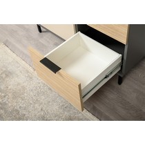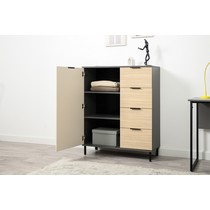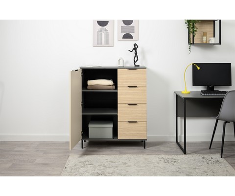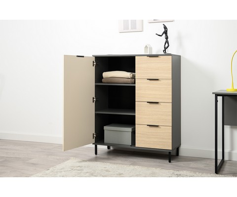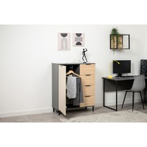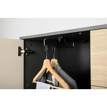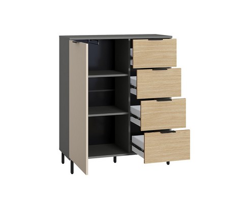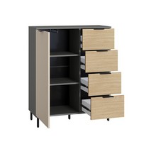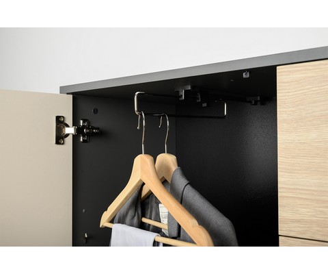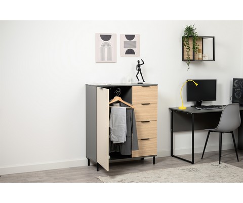 Комод состоит из четырех выдвижных ящиков и отсека с выдвижной металлической штангой и дверцей.