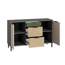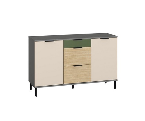 Комод Марвэл 16.234.02 выполнен в стильном сочетании темно-серого корпуса с яркими фасадами в цвете сатин, плэйн и дымчатый зеленый.
