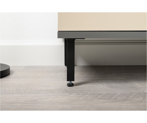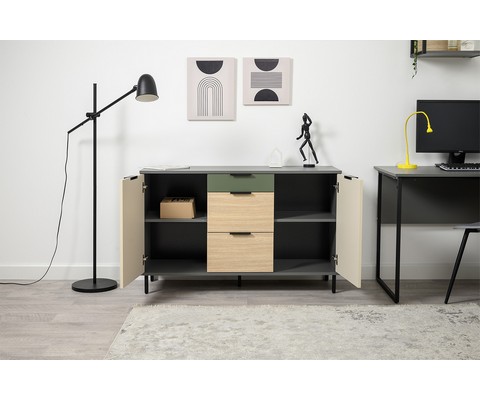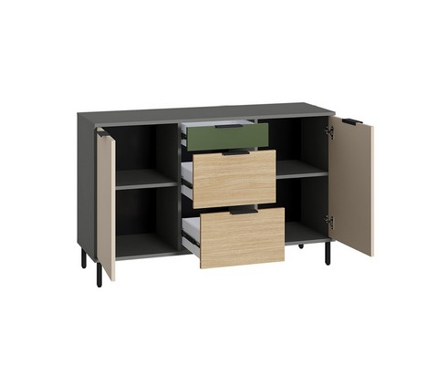 Комод состоит из трех выдвижных ящиков и двух боковых отсеков с распашными дверцами и полками.