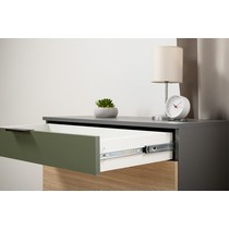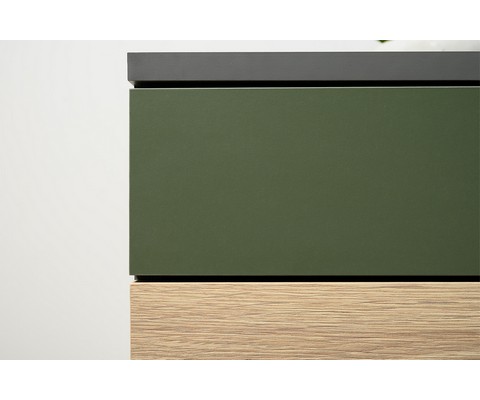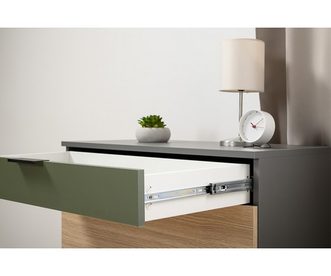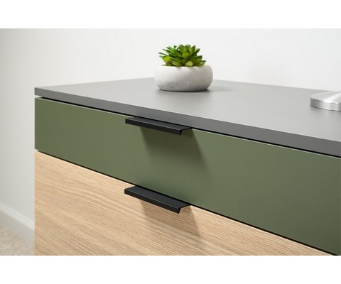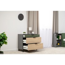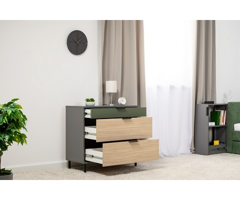 Комод Марвэл 16.234.03 выполнен в стильном сочетании темно-серого корпуса с яркими фасадами в цвете плэйн и дымчатый зеленый.