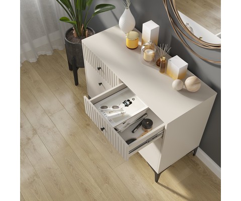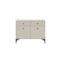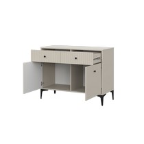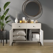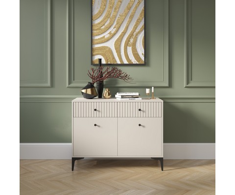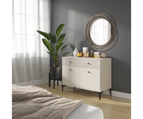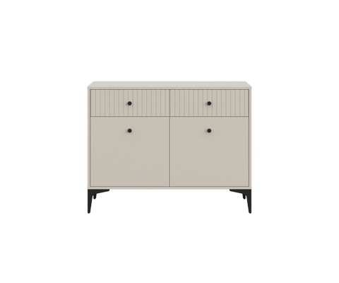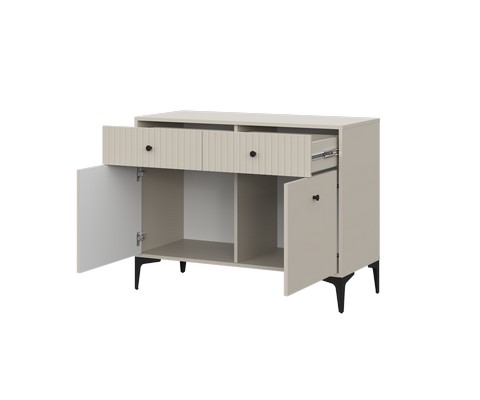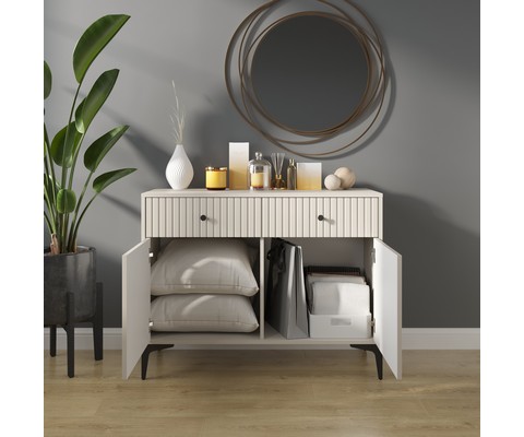 Комод MOON КМ-1.1 оснащен двумя вместительными выдвижными ящиками и двумя распашными дверцами, что обеспечивает удобное разделение пространства для хранения различных категорий вещей.