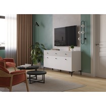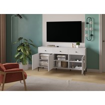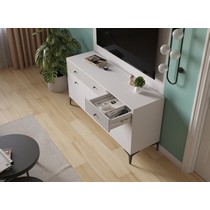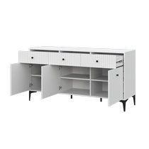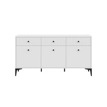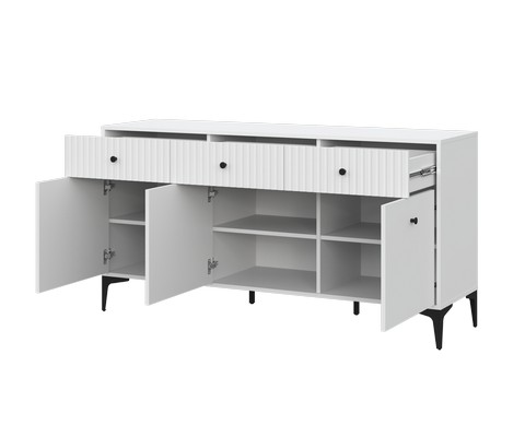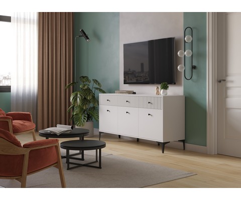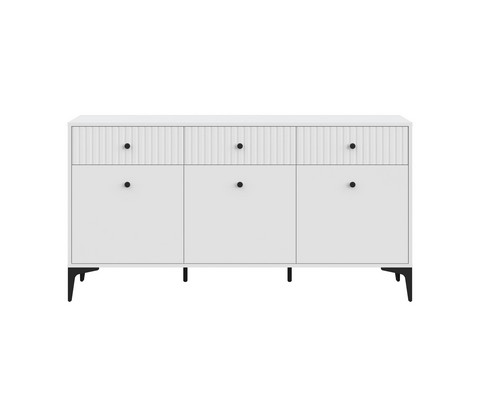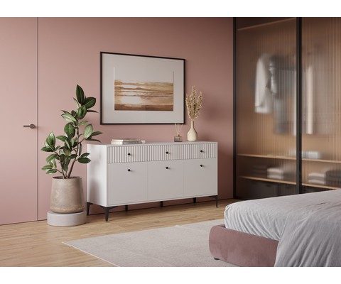 Комод MOON КМ-2.1 оснащен тремя вместительными выдвижными ящиками и тремя распашными дверцами, что обеспечивает удобное разделение пространства для хранения различных категорий вещей.