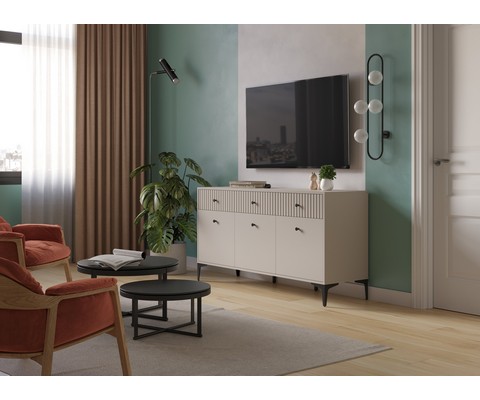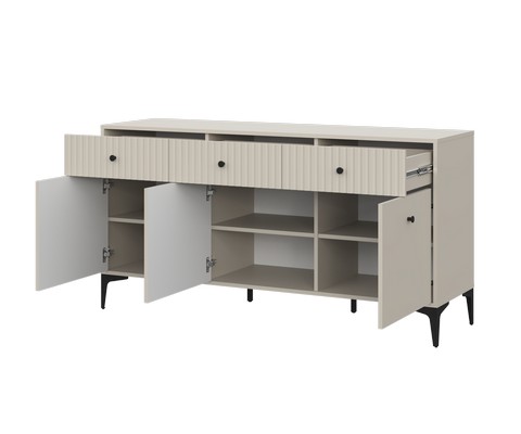 Комод MOON КМ-2.1 оснащен тремя вместительными выдвижными ящиками и тремя распашными дверцами, что обеспечивает удобное разделение пространства для хранения различных категорий вещей.