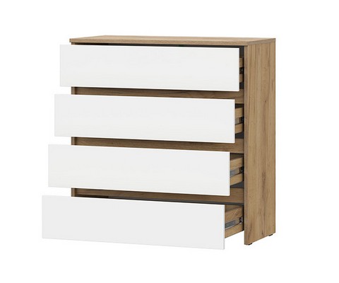 Комод Некст 1 с 4 ящиками (дуб золотой/белый) оснащен шариковыми направляющими и скрытой фурнитурой.