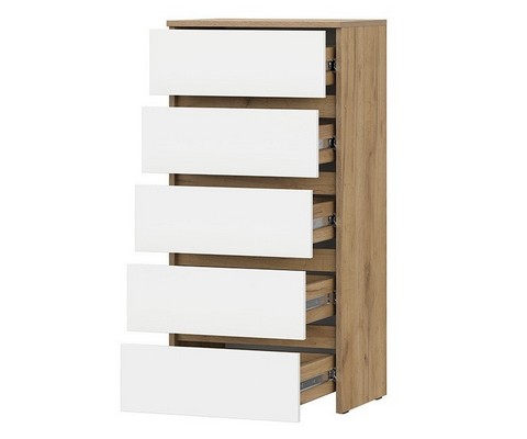 Комод Некст 1 с 5 ящиками (дуб золотой/белый) оснащен шариковыми направляющими и скрытой фурнитурой.