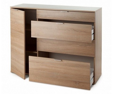 Дополнительно:Комод НК-3 дуб сонома имеет 4 выдвижных ящика с шариковыми направляющими и распашную дверцу