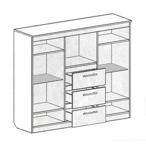 Состоит из двух отделений со стеклянным фасадом, закрытого отделения и трех выдвижных ящиков.