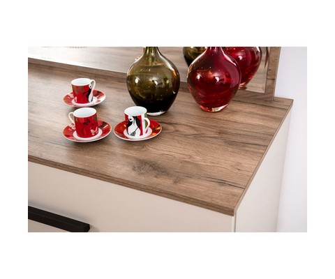 На столешнице комода можно разместить телевизор или укомплектовать модуль зеркалом из той же коллекции.