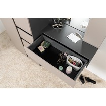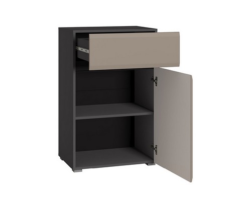 Комод выполнен в модном сочетании цветов корпуса антрацит и фасадов веллюто капучино.