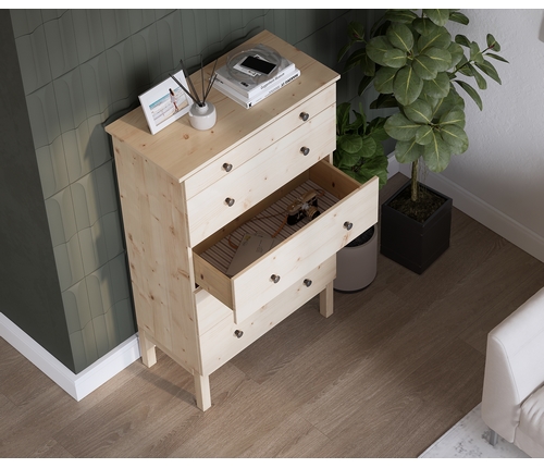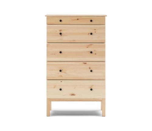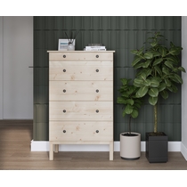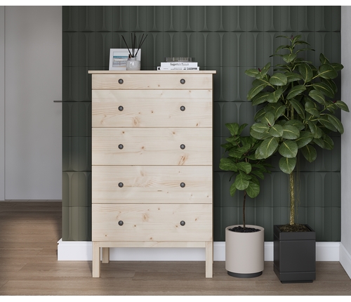 Высокий комод Тирана с пятью выдвижными ящиками станет отличным решением для создания уюта и организации пространства в гостиной, спальне или прихожей в скандинавском стиле.