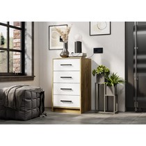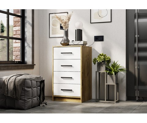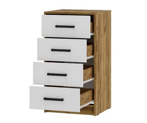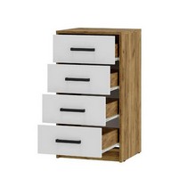 4 выдвижных ящика оснащены роликовыми направляющими и удобными ручками. Регулируемые опоры позволяют установить комод даже на неровном полу.