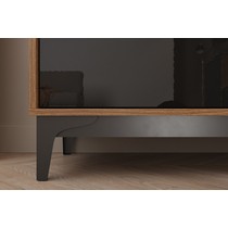 Две элегантные распашные дверцы скрывают просторное внутреннее пространство c полками и один выдвижной ящик с механизмом полного выдвижения.