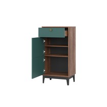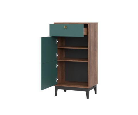 Две элегантные распашные дверцы скрывают просторное внутреннее пространство c полками и один выдвижной ящик с механизмом полного выдвижения.