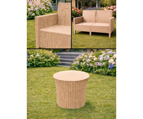 Стильный и практичный комплект из двух кресел, двухместного дивана и кофейного столика с эффектным плетением под ротанг, созданный для комфортного отдыха в саду, на террасе или у бассейна.