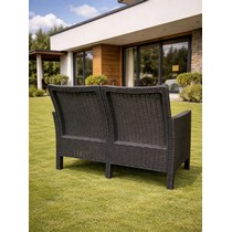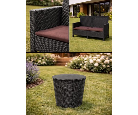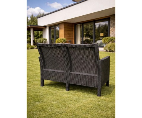 Стильный и практичный комплект из двух кресел, двухместного дивана и кофейного столика с эффектным плетением под ротанг, созданный для комфортного отдыха в саду, на террасе или у бассейна.
