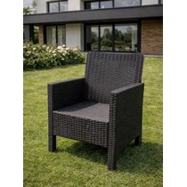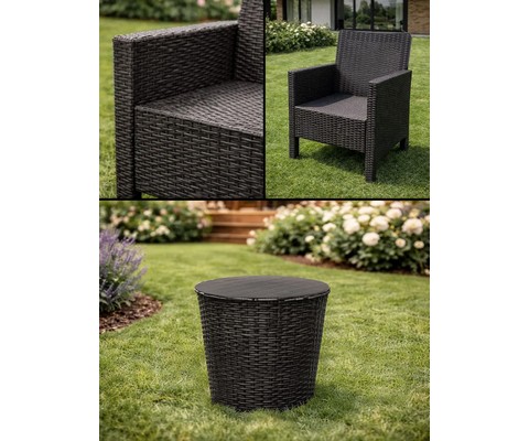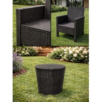 Стильный и практичный комплект из двух кресел и кофейного столика с эффектным плетением под ротанг, созданный для комфортного отдыха в саду, на террасе или у бассейна.