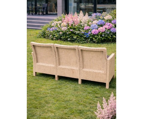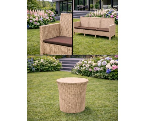 Комплект 2 садовых кресла, трехместный диван и столик под ротанг СадКо подарит вам комфортный отдых на свежем воздухе, объединяя стильный дизайн, практичность и надежность.