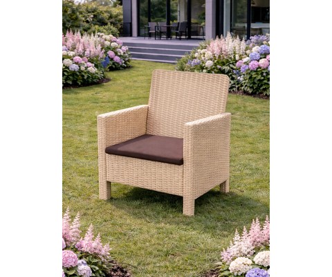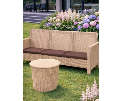 Комплект 2 садовых кресла, трехместный диван и столик под ротанг СадКо (бежевый с коричневыми подушками)