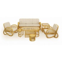 Каркас - натуральный ротанг, подушка - ткань рогожка с мягким наполнителем, столешница - стекло.
