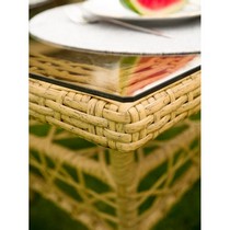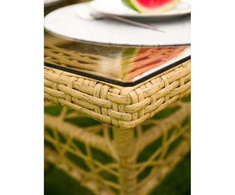 Стол со стеклянной столешницей визуально облегчает композицию и позволяет любоваться красивым плетением основания.