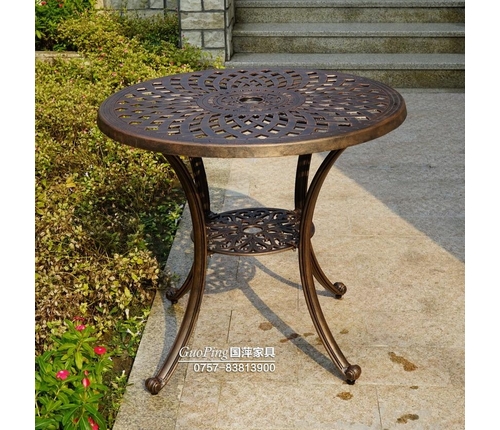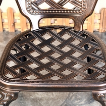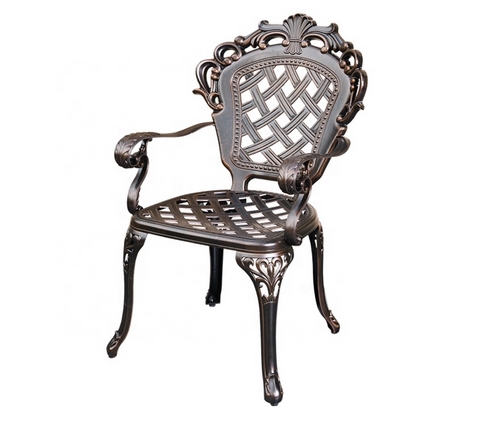 Комплект мебели из литого алюминия состоит из стола и двух кресел с подлокотниками.