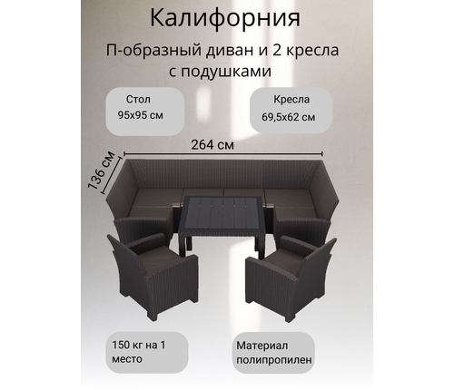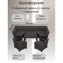 Комплект мебели под ротанг Калифорния (California) с П-образным диваном 136х264х136 см 6 мест, 2 креслами, с подушками на сиденье и столом 95х95 см