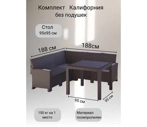 Комплект мебели под ротанг Калифорния (California) с угловым диваном 188х188 см 5 мест без подушек, со столом 95х95 см.