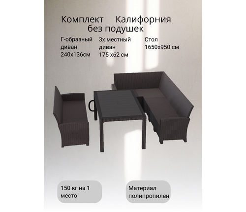 Комплект мебели под ротанг Калифорния (California) с угловым диваном 240х136 см, 3х-местным диваном 175х62 см, без подушек, со столом 165х95 см.