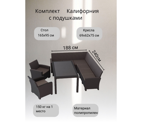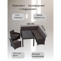 Комплект мебели под ротанг Калифорния (California) с угловым диваном 240х188 см 6 мест, 2 креслами, с подушками на сиденье и столом 165х95 см.