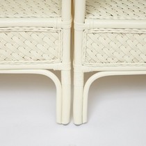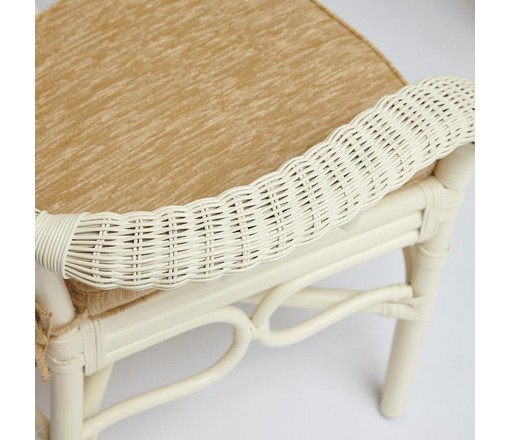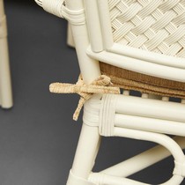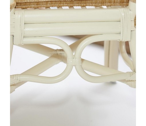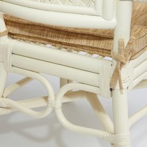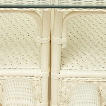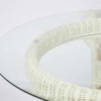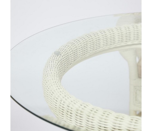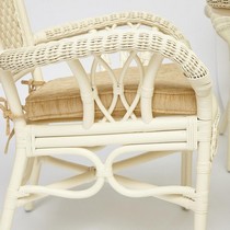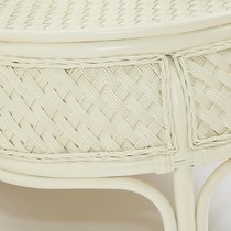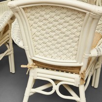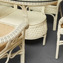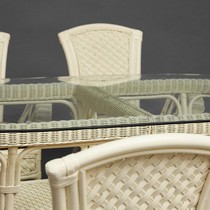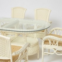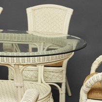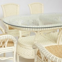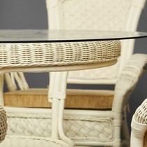 Каркас - натуральный ротанг, сиденье - ткань, столешница - стекло.