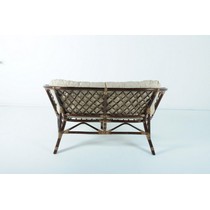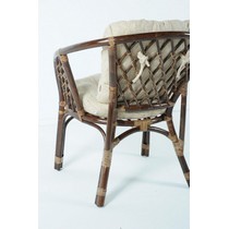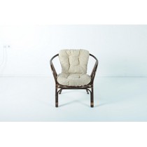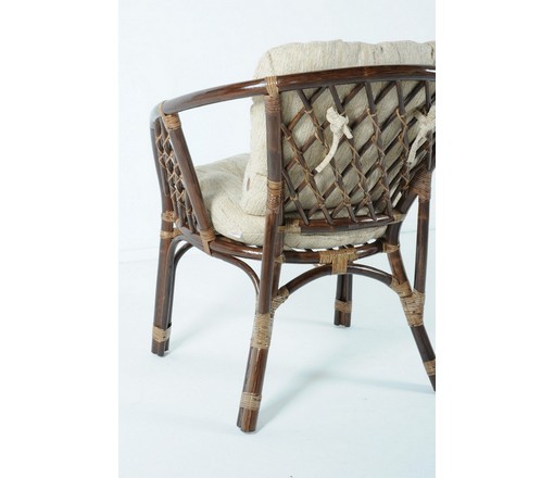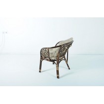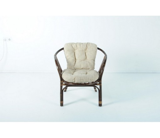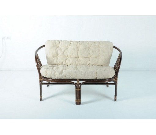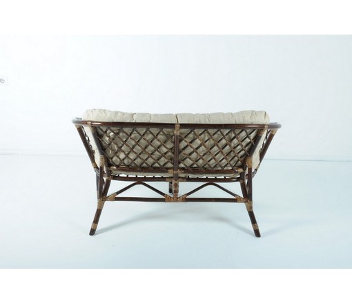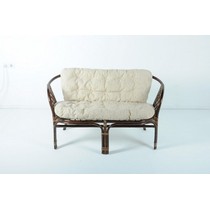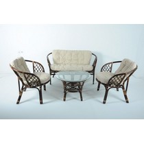 Каркас - натуральный ротанг, подушка - ткань рогожка с мягким наполнителем, столешница - стекло.