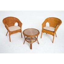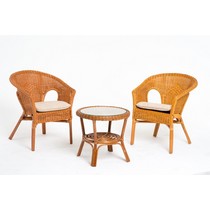 Каркас - натуральный ротанг, подушка - ткань рогожка с мягким наполнителем, столешница - стекло.