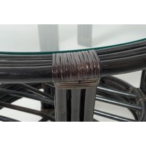 Материалы изделия: натуральный ротанг (каркас), ткань рогожка с мягким наполнителем (подушка), стекло (столешница).