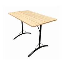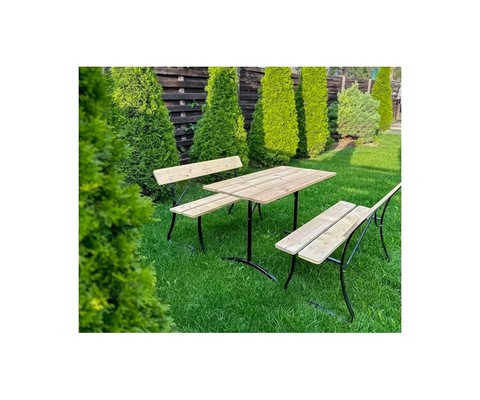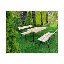 Стол и скамейки выполнены из натурального дерева и прочного металла.