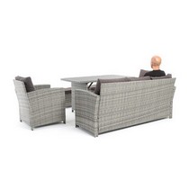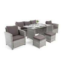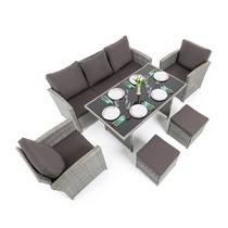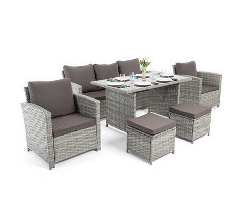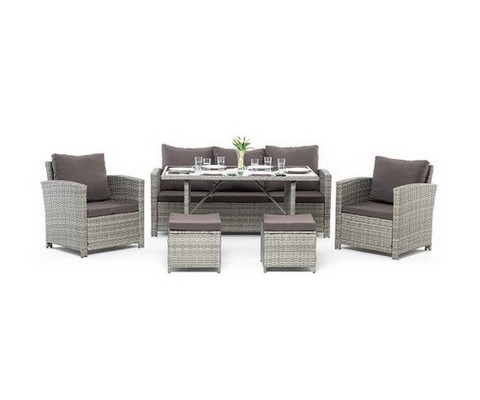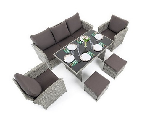 В набор входят: просторный трехместный диван, два кресла, два пуфа и практичный стол со стеклянной столешницей.