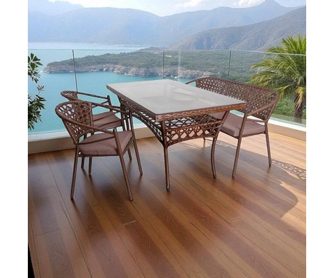 Обеденный комплект включает в себя стол, два стула и трехместный диван с подушками.