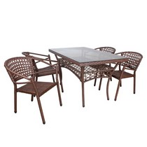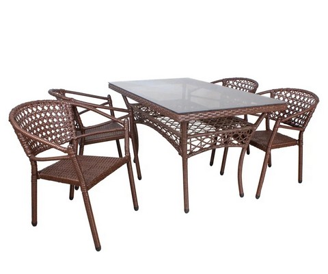 Комплект садовой мебели со столом Адлер длиной 1,4 метра и четырьмя стульями Латте с ротангом подходит для использования на открытых верандах и террасах.