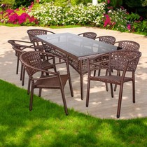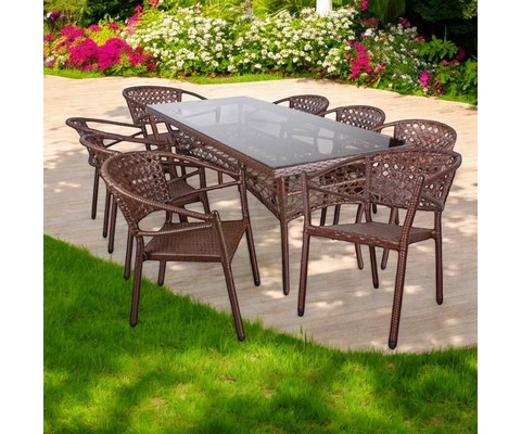 Комплект садовой мебели со столом Адлер длиной 2 метра и восемью стульями Латте с ротангом подходит для использования на открытых верандах и террасах.