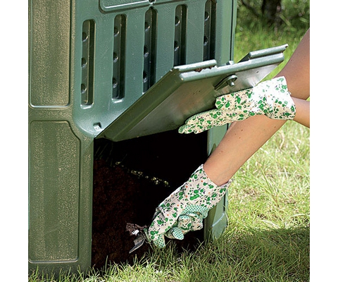 Компостер имеет удобную ручку для закрывания крышки, а в нижней части – откидные створки, которые обеспечивают постоянный доступ к готовому удобрению.