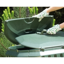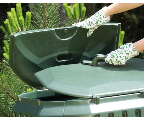 Компостер имеет удобную ручку для закрывания крышки, а в нижней части – откидные створки, которые обеспечивают постоянный доступ к готовому компосту.