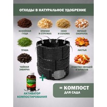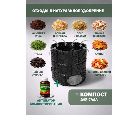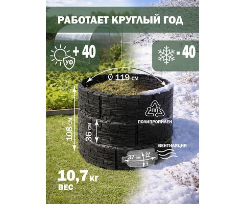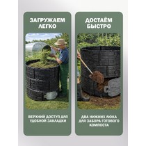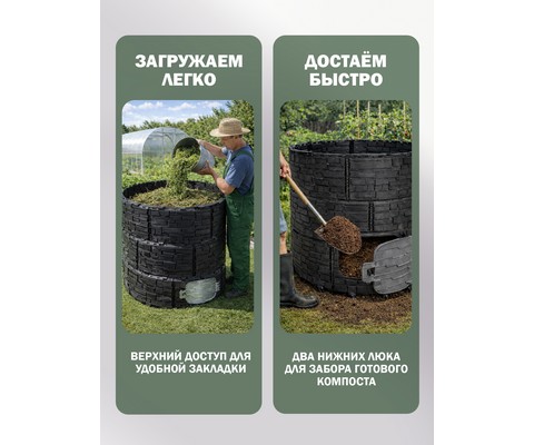 Усиленная конструкция с ребрами жесткости, двумя дверцами-люками и надежной крышкой обеспечивает долговечность, удобство загрузки и извлечения компоста.