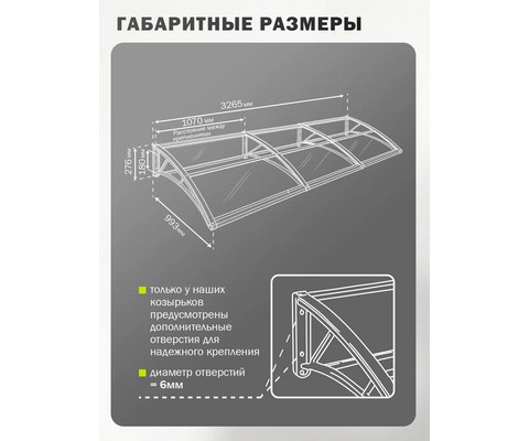 Поликарбонат толщиной 6 мм - ударопрочный, легкий, устойчивый к градам и механическим повреждениям. Не желтеет со временем, хорошо пропускает свет, но защищает от ультрафиолета.