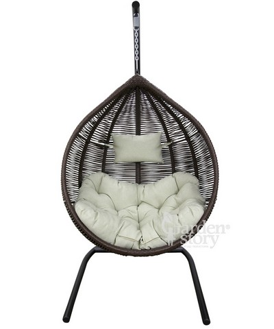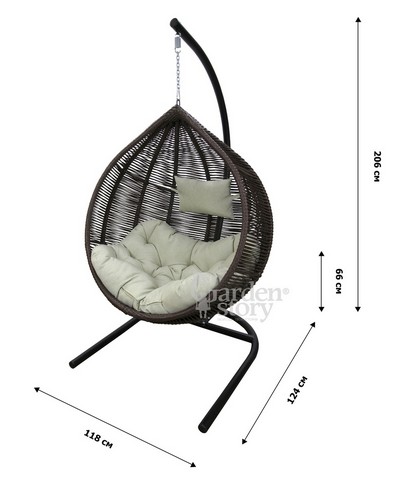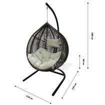Материалы: каркас - сталь, покрытие - краска порошковая полимерная, материал корзины - искусственный ротанг, материал чехла мягкого элемента - водоотталкивающая ткань, тип подвеса - металлическая цепь, наполнитель мягкого элемента/матраса - синтепон.