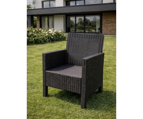 Стильное и практичное кресло с эффектным плетением под ротанг, созданное для комфортного отдыха в саду, на террасе или у бассейна.