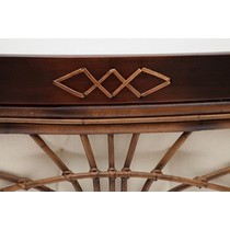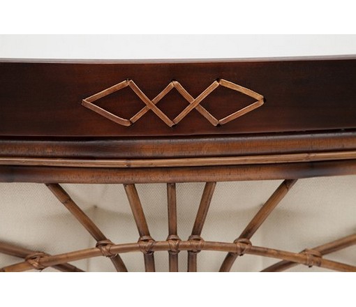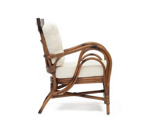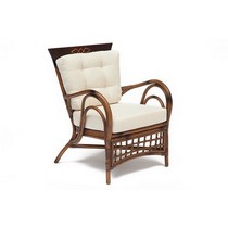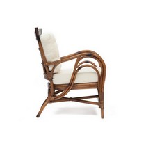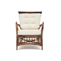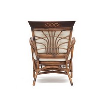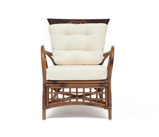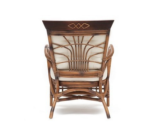 Кресло из натурального ротанга с подлокотниками и деревянной вставкой античной отделки.