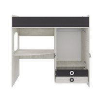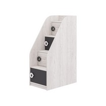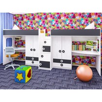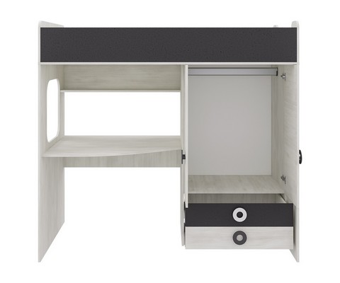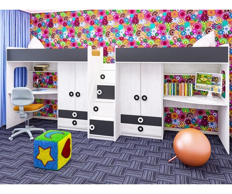 Оснащение: лестница-комод на 4 ящика, стол с радиусной столешницей, навесная полка, световое окошко «иллюминатор» шкаф распашной со штангой, два ящика полного выдвижения на шариковых направляющих.