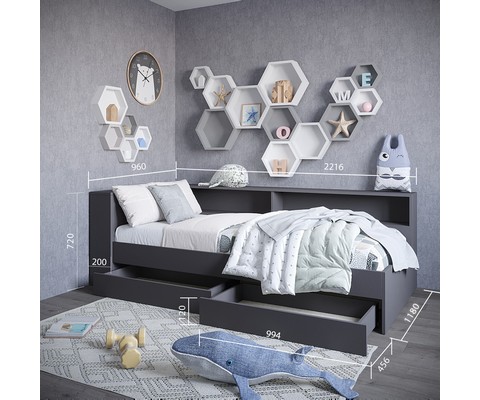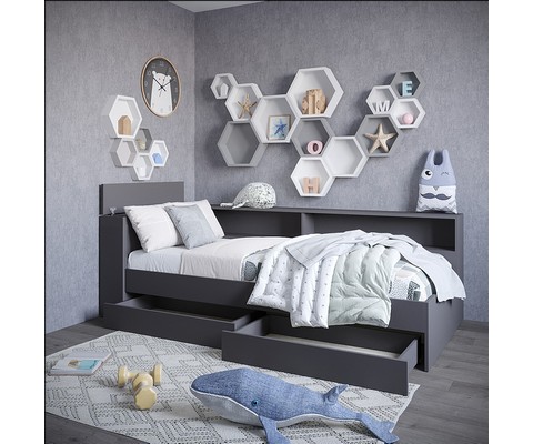 Кровать Ксения 90х200 с ящиками и прикроватным блоком (графит)